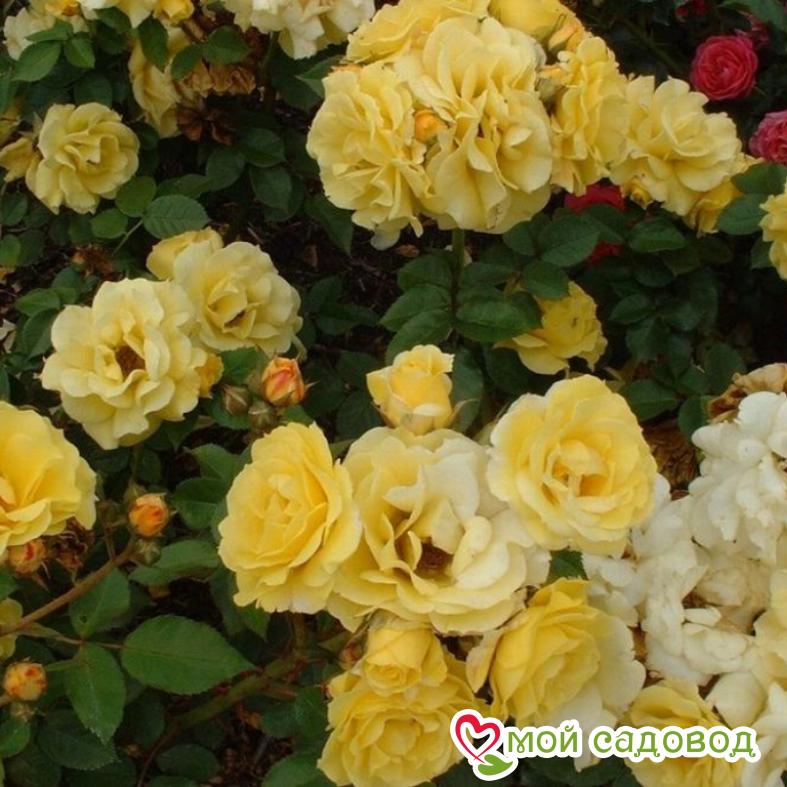 Саженцы представленного на фото сорта вырастают в виде раскидистых, довольно густых кустов с ярко-зелёными листьями. В диаметре они достигают 30 – 40 см, а в высоту – в пределах 40 см. Цветы собраны в кистевидные соцветия по 3 – 5 штук. Бутоны полные, махровые, чашевидные, диаметром 3,5 – 5 см. Лепестки насыщенно-жёлтые, со слегка подкрученными и заострёнными краями. Цветение обильное и непрерывное. Длится оно до начала заморозков. Роза источает нежный, приятный аромат.
